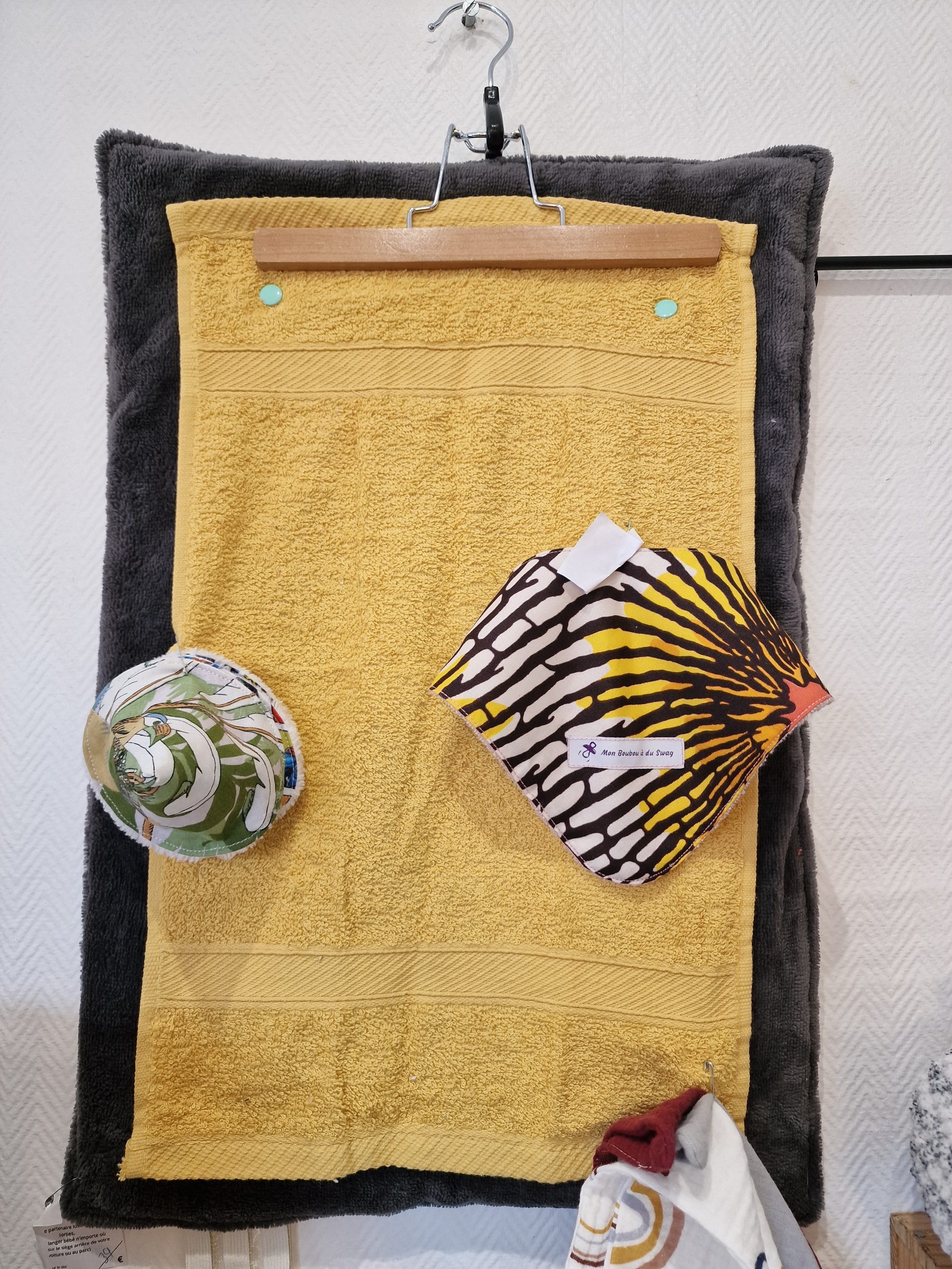 • Une serviette de change qui s’attache avec des boutons-pressions en résine (possibilité d’en avoir d’autres sur commande)